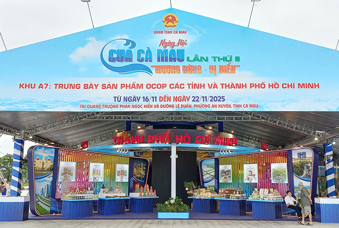 Trong khuôn khổ Ngày hội Cua Cà Mau - Lần thứ II năm 2025, diễn ra từ ngày 16 - 22/11 tại Thành phố Cà Mau, không gian trưng bày quảng bá sản phẩm của Thành phố Hồ Chí Minh đã trở thành một điểm nhấn quan trọng, góp phần tạo nên bức tranh xúc tiến thương mại năng động giữa hai địa phương. Khu vực trưng bày do Trung tâm Xúc tiến Thương mại và Đầu tư TP.HCM (ITPC) phối hợp với Sở Nông nghiệp và Môi trường TP.HCM và các đơn vị liên quan tổ chức, quy tụ 25 doanh nghiệp của Thành phố, đại diện cho các nhóm ngành hàng tiêu biểu như thực phẩm - đồ uống, sản phẩm chế biến, gia vị, hàng nông nghiệp, quà tặng đặc sản và các sản phẩm OCOP.