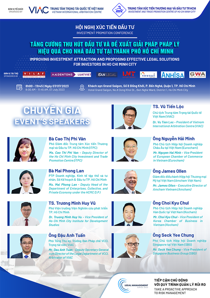 Với mục tiêu cập nhật thông tin mới về thị trường, hành lang pháp lý về đầu tư, thực tiễn hoạt động đầu tư tại TP. Hồ Chí Minh, cùng với đó là đưa ra các khuyến nghị, giải pháp pháp lý thiết thực cho các nhà đầu tư nói riêng và cộng đồng doanh nghiệp nói chung, Trung tâm Xúc tiến Thương mại và Đầu tư Thành phố Hồ Chí Minh (ITPC) phối hợp cùng Trung tâm Trọng tài Quốc tế Việt Nam (VIAC) triển khai Hội Nghị Xúc tiến Đầu tư với chủ đề “Tăng cường thu hút đầu tư và đề xuất giải pháp pháp lý hiệu quả cho nhà đầu tư tại Thành phố Hồ Chí Minh”.