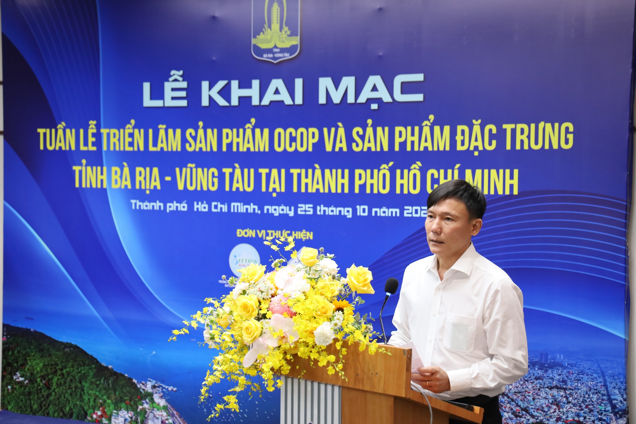 Phát biểu tại sự kiện, ông Lê Anh Hoàng - Phó Giám đốc phụ trách Trung tâm Xúc tiến Đầu tư, Thương mại, Du lịch tỉnh Bà Rịa – Vũng Tàu nhấn mạnh: Chương trình “Tuần lễ triển lãm sản phẩm OCOP và sản phẩm đặc trưng tỉnh Bà Rịa – Vũng Tàu tại Thành phố Hồ Chí Minh” là cơ hội để các đơn vị sản xuất tỉnh Bà Rịa – Vũng Tàu quảng bá, giới thiệu, kết nối các sản phẩm OCOP, sản phẩm đặc trưng, sản phẩm đặc sản đến với các đơn vị phân phối, người tiêu dùng, du khách quốc tế tại Thành phố Hồ Chí Minh. Với thông điệp “Liên kết để tăng sức cạnh tranh, kết nối để mở rộng thị trường”, chương trình sẽ tạo điều kiện thuận lợi nhất cho các doanh nghiệp, các đơn vị sản xuất tỉnh Bà Rịa – Vũng Tàu tìm kiếm được đối tác, phát triển kinh doanh theo hướng bền vững.